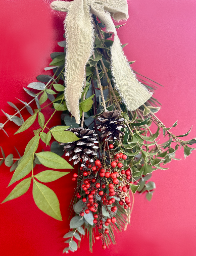 クリスマスとお正月を兼ねた、季節をつなぐナチュラルスワッグ。クリスマスからお正月まで長く楽しめる“和モダンスワッグ”です。縁起の良い素材が運気を整え、家に幸せを呼び込みます。クリスマスの温かさも、お正月の清々しさもこのひとつで、玄関やリビングに飾れば、季節の移ろいとともに“良い気”がふわっと広がります。